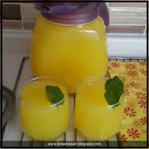- 4- Then, add 1.5 to 2 litres of water depending on the strength you like. After these processes, leave to rest 5-10 minutes then strain through some muslin or fine filter. Squeeze out the remnants and discard. Pour into Bottles or Glass pitcher and place in freezer for a while. Then, pour in the lemonade in glasses! Garnish each glass with a leaf of fresh mint.